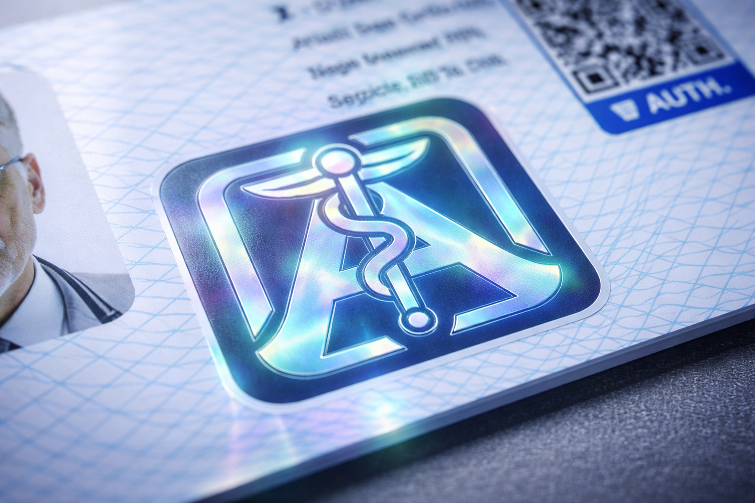 - Fotoet kombineret med de andre sikkerhedselementer gør lægekortet til et troværdigt og professionelt bevis på din autorisation.