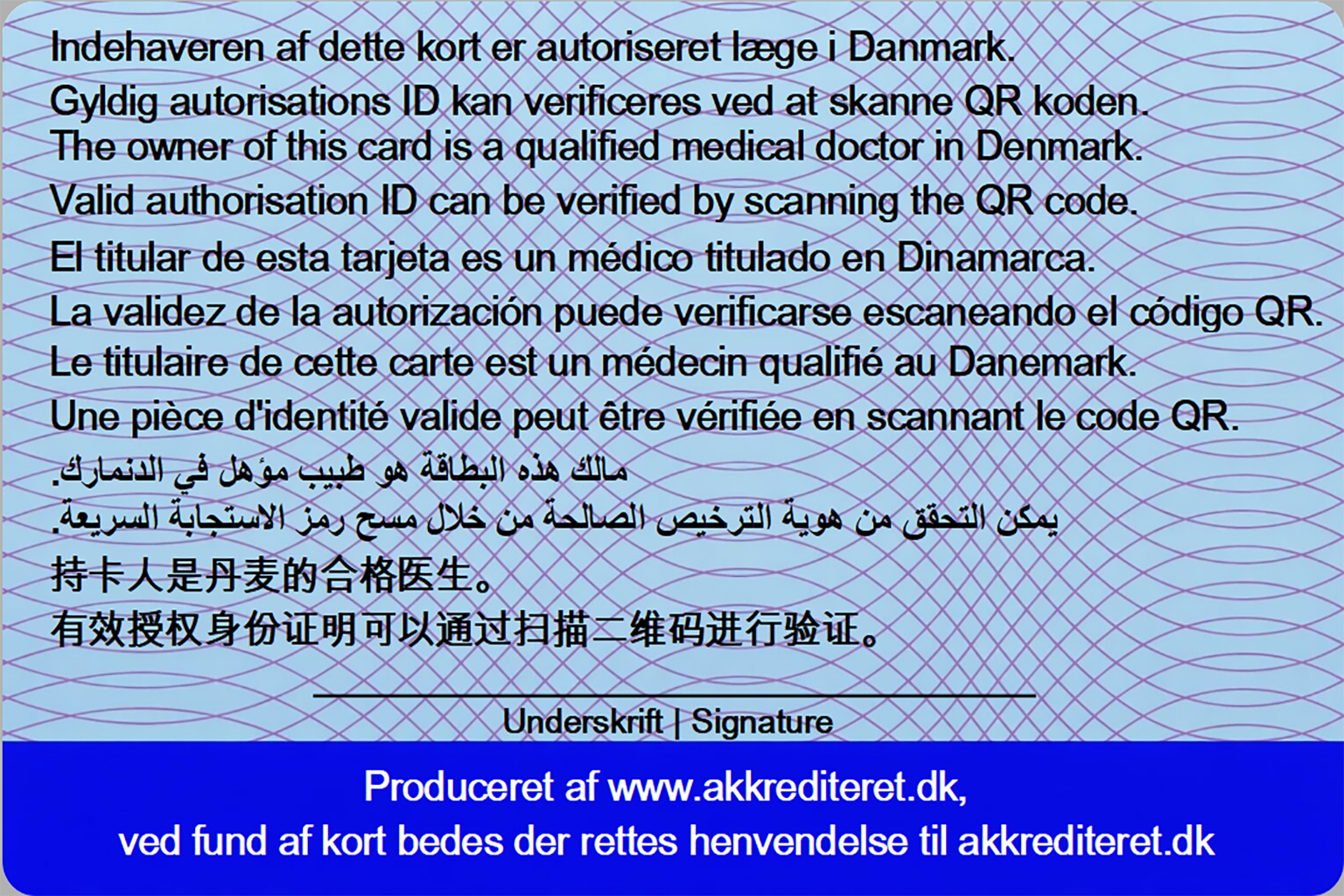 - Hvert kort indeholder en unik QR-kode, som kan scannes af både patienter, sundhedspersonale og autoriserede instanser for at verificere din gyldige autorisation.